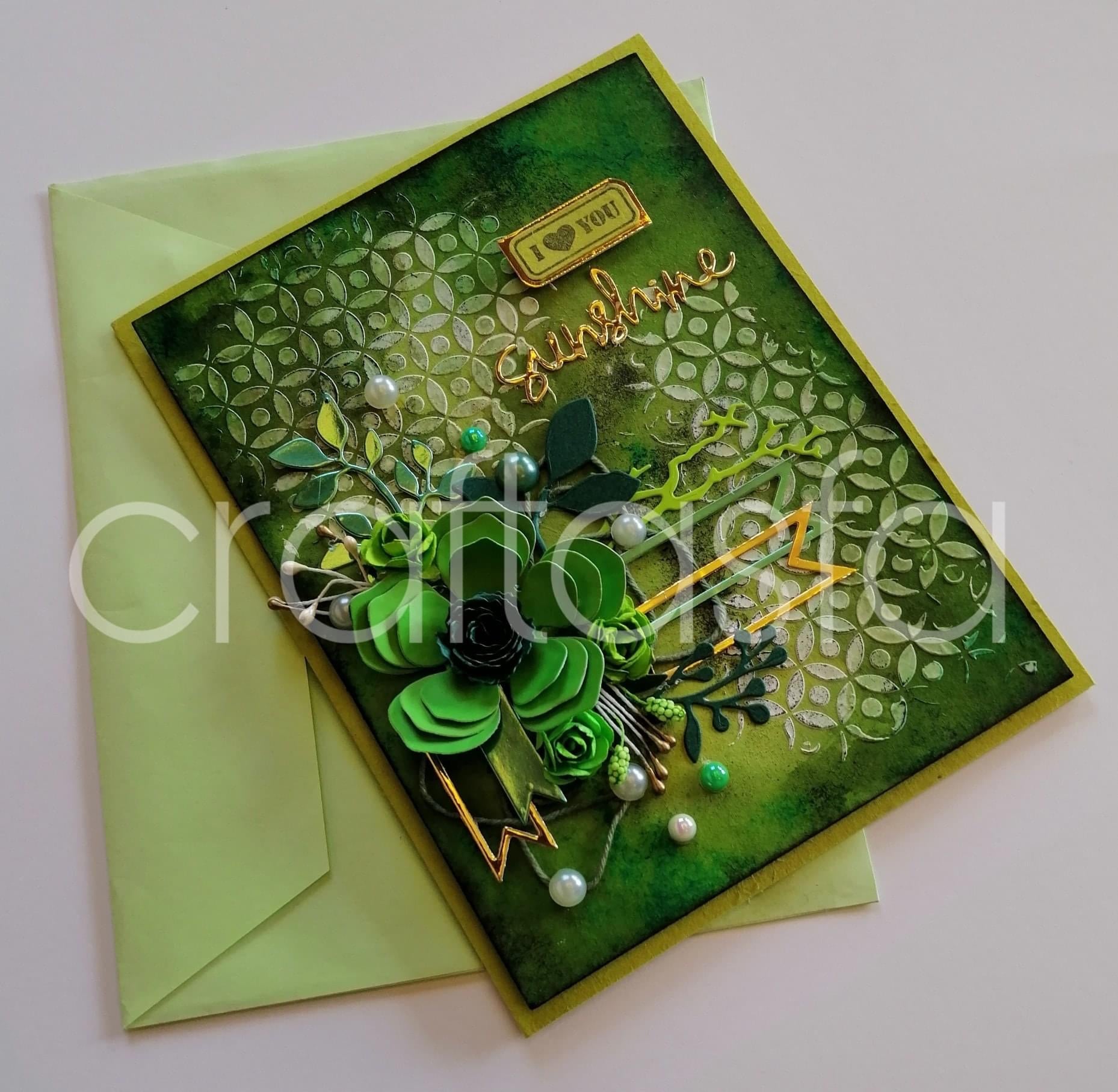 Features:- Handcrafted with premium textured cardstock and layered green floral embellishments