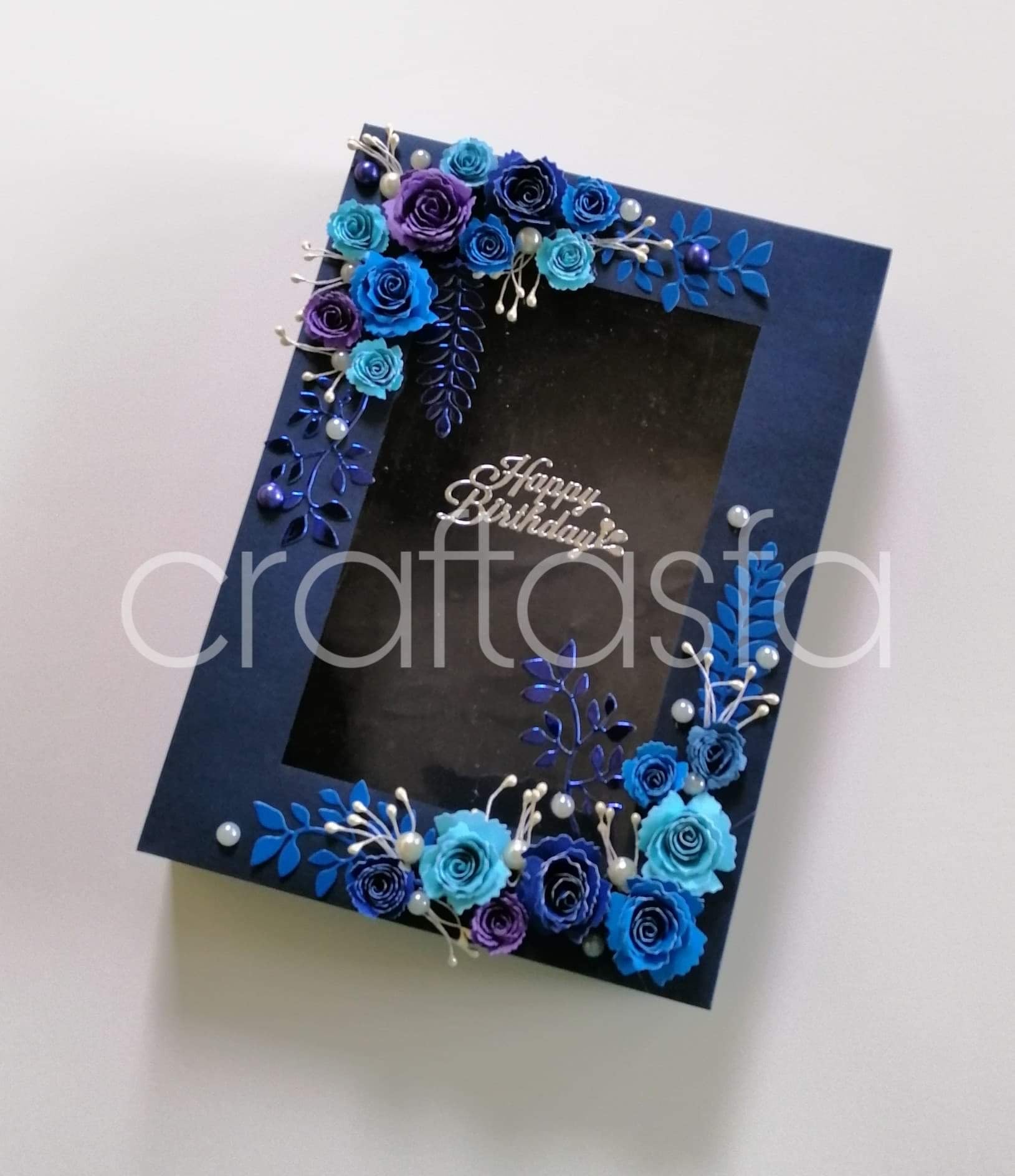 Make birthdays truly unforgettable with this exquisite handmade keepsake box, beautifully crafted in deep navy and adorned with a vibrant array of blue and purple paper roses. The elegant window lid showcases a delicate "Happy Birthday" greeting in silver, surrounded by intricate floral embellishments, pearl accents, and metallic foliage for a sophisticated, one-of-a-kind presentation.
